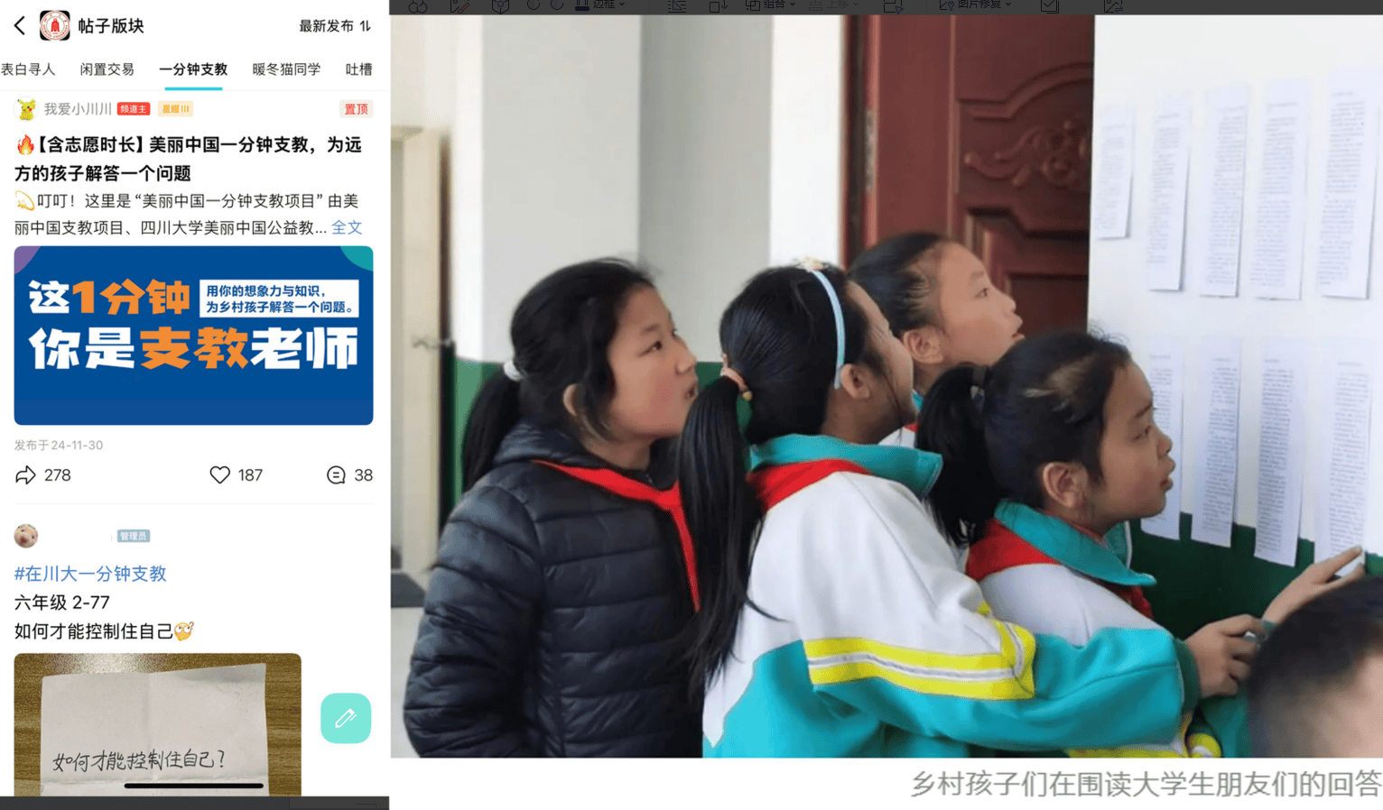 美丽中国的支教老师们,在两年的支教生涯中,深刻感受到了乡村孩子们内心的丰富世界与成长的烦恼。他们渴望被理解、被关注,而“一分钟支教”活动正是为了回应这一需求而生。通过与高校社团的合作,让大学生们成为孩子们的“线上导师”,为他们带去知识与温暖。
